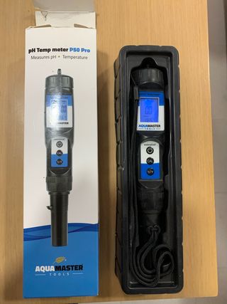 Medidor de pH y temperatura Aquamaster P50 Pro, ideal para mediciones precisas. - Pantalla digital clara. - Botones de calibración y selección de unidad. - Diseño impermeable.