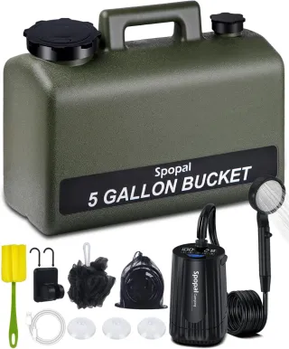 Set de ducha portátil para camping con un tanque de 5 galones. Incluye bomba recargable y pantalla de temperatura. - Bomba de agua recargable con pantalla digital. - Manguera flexible y cabezal de ducha. - Accesorios adicionales: esponja, ganchos, bolsa de malla y ventosas. Spopal Ducha Portatil Camping, [Pantalla Temperatura] 10000mAh Recargable Ducha Camper con 20L Garrafa Agua de Plástico, Modo de 5 Velocidad, Ducha Electrica para Acampar, Ducha de Playa & Perros.