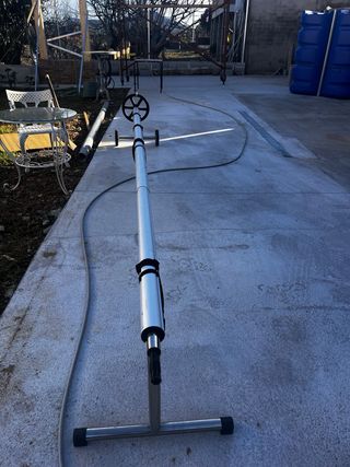Enrollador para cubrir piscinas, marca Loma. - Estructura metálica y piezas de plástico. De 2 a 4,5m. Perfecto estado. Sin lona. 5 trinchas de agarre