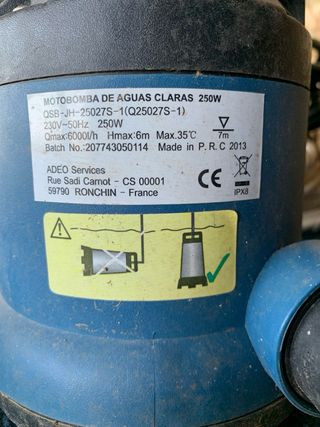 Motobomba de aguas claras para diversas aplicaciones. - Potencia de 250W. - Fabricada en plástico y goma.