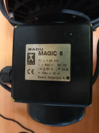 Bomba depuradora BADU MAGIC 6. - Potencia: 0,45 kW. - Voltaje: 230 V. - Frecuencia: 50 Hz. - Intensidad: 2,30 A. - Protección IP X4. - Altura máxima: 12 m. - Fabricante: Speck Española S.A.