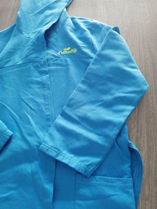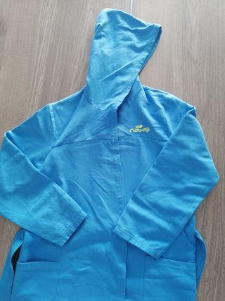 Albornoz infantil de la marca Nabaiji, ideal para después de la piscina o la playa. Es suave y cómodo. - Talla 8-10 años. - Con capucha. - Dos bolsillos delanteros. - Cinturón para ajustar.