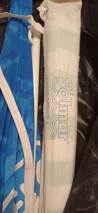 Sombrilla de playa o jardín de la marca Solmar. Perfecta para protegerse del sol. - Diseño con ondas y el nombre de la marca. - Indicación de 180cm de diámetro.