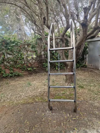 Escalera de acero inoxidable para piscina. - Fabricada en metal resistente. - Diseño curvo para facilitar el acceso. - Tres peldaños antideslizantes.