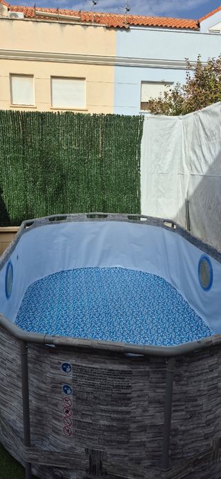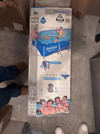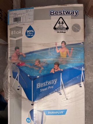 Vendo piscina desmontable Bestway Steel Pro comprada el verano pasado en Leroy Merlin (nos costó más de 300€). Solo se ha usado esa temporada y está impecable, muy bien cuidada. La vendemos únicamente porque este año no tenemos espacio para montarla. Es un modelo de gama alta, mucho más resistente que las básicas: Medidas: 300 cm de largo x 201 cm de ancho y 81 cm de alto (una altura ideal para que sea segura pero quepa bastante agua). Tecnología Duraplus: Paredes de 3 capas ultra resistentes frente a pinchazos. Estructura FrameLink: Conectores en T que evitan la corrosión y hacen que sea muy estable.
