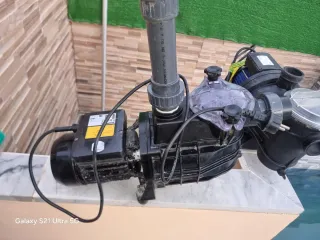 Bomba de piscina en buen estado. Dos bonbas una de 1cv otra de 75 - Fabricada en metal y plástico. - Color negro y transparente.