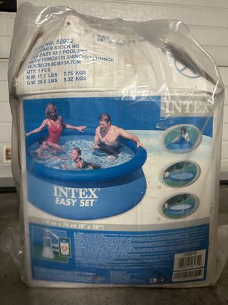 Cobertor para piscinas hinchables Intex de la línea Easy Set con diámetro 244 cm. El cobertor tiene un diámetro de 2.21 metros y el voladizo es de 30 cm De color azul marino, está fabricado con vinilo resistente de 0.18 mm; el cobertor tiene pequeños orificios de drenaje para evitar acumulaciones de agua. Incluye cuerda para sujetar el cobertor a la piscina ante situaciones climatológicas adversas como el viento. Está sin estrenar. Lo compré por equivocación de esa medida y no me servía.