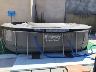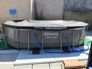 Piscina elevada Bestway Power Steel con estructura metálica. Medidas 4,27x2.50x1 m de alto. Se ha montado dos veranos. Se vende porque hemos echo una de obra. No tienen ningún pinchazo. Como está la depuradora es de arena. También tenemos la original de filtro que la entregaríamos con la piscina y el cobertor original. Las mangueras también han sido cambiadas por unas mejores. La piscina está ya desmontada. - Cubierta protectora incluida. - Mangueras de conexión visibles. - Filtro de arena + filtro de cartucho.