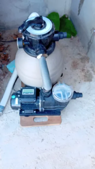 Sistema de depuración para piscinas, compuesto por bomba y filtro. - Bomba de agua negra. - Filtro de arena beige.