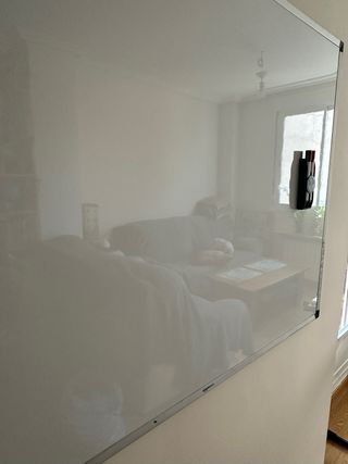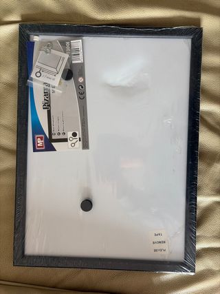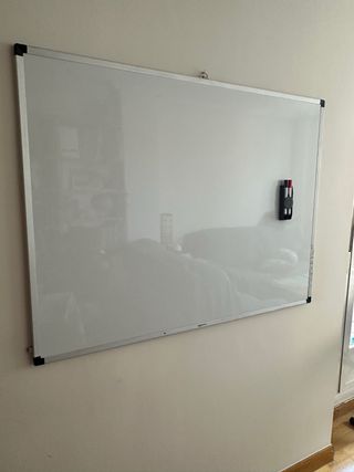 Pizarra blanca con marco metálico y detalles en plástico. - Superficie lisa para escribir. - Ideal para notas o planificación. Es grande, si necesitas las medidas preguntame