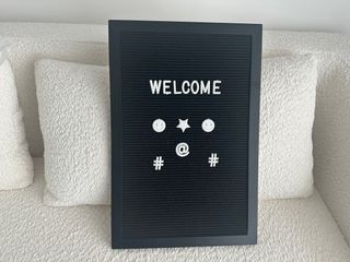 Pizarra decorativa con marco negro y letras blancas. - Incluye letras y símbolos para personalizar mensajes. - Ideal para colocar en casa o en la oficina.