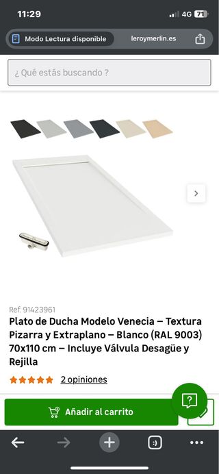 ℹ️ Plato de ducha modelo Venecia, extraplano y de textura pizarra antideslizante. ✅ Totalmente nuevo a estrenar en su embalaje intacto. 📦 Incluye su válvula de desagüe y rejilla que oculta la válvula. 📏 Medidas: 70x110 cm ⚪️ Color: Blanco (RAL 9003) Lo vendo a estrenar ya que el baño iba a ser de 110cm de ancho, pero al final ha sido de 120, por lo que tuve que comprar uno nuevo y este ya no me dejaban devolverlo por fechas... No se llegó tan siquiera a desembalar, y sé que es bueno ya que tengo el mismo modelo y estoy encantado con él. Se puede instalar por encima del suelo o a ras de suelo como yo y queda de lujo. Escucho ofertas