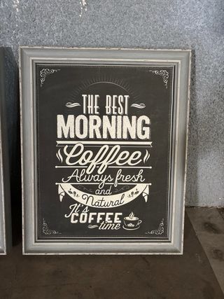 Set de dos cuadros decorativos con temática de café, estilo vintage. - Diseño tipo pizarra con letras blancas. - Marco plateado.
