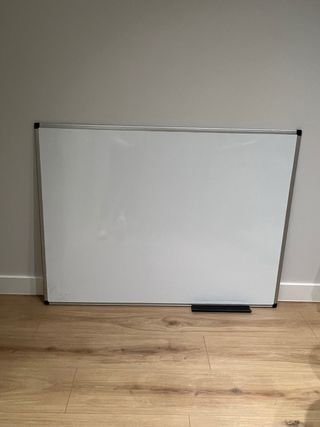 Pizarra blanca de gran tamaño, ideal para oficinas, despachos o aulas. Se utiliza con rotuladores borrables y es muy fácil de limpiar (simplemente con un trapo o con alcohol de limpieza y un trapo para que te quede como nueva). La superficie es también magnética, por lo que puedes colgar papeles con tan solo un imán. - Medidas: 90 x 120 cm. - Marco de aluminio. - Incluye bandeja gris para los rotuladores. Está nueva, apenas ha tenido uso. Se pone en la pared mediante 2 ó 4 tornillos, gracias a los agujeros que tiene en las esquinas. A recoger en Sevilla Este. Te puedo abrir el garaje para que la cargues más cómodamente.