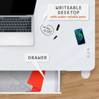 Escritorio de altura regulable. Muy estable, inclusive en su máxima altura. Base en metal y tablero en cristal templado blanco que permite escribir en si mismo con rotulador de pizarra. Es de los pocos escritorios elevables que viene con cajonera. Puertos USB, cargador de móvil en tablero, botones digitales para subir/bajar el escritorio. Menos de 6 meses de uso, muy bien cuidado.