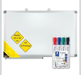 ¡Nuevo y sin uso, pero con varios desperfectos mostrados en las fotos! Pizarra blanca con bandeja para rotuladores, aprox. 90 x 60 cm, incl. 4 rotuladores para pizarra blanca con punta redonda de aprox. 2 mm de ancho de trazo ColorMulticolored MaterialAluminio Usos recomendados para el productoOficina Tipo de montajeMontaje en pared Componentes incluidosRotuladores, Bandeja para rotuladores Pizarra blanca compacta y ligera de aprox. 90 x 60 cm con marco de aluminio y bandeja para rotuladores, incluye 4 rotuladores Lumocolor para pizarra blanca en rojo, azul, verde y negro