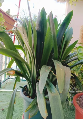 Planta de interior Clivia con hojas verdes y alargadas. Se encuentra en una maceta de color marrón. - Hojas verdes y anchas. - Maceta de cerámica marrón. Mira mi perfil gracias