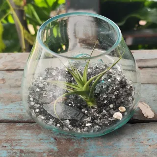 Pequeño terrario de cristal con una planta de aire en su interior. La base está decorada con grava y pequeñas piedras. El diseño del cristal es como si fuera la parte de abajo de una botella. - Diseño moderno y minimalista. - Ideal para decorar cualquier espacio.