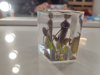 Pieza decorativa única con plantas carnívoras preservadas en resina transparente. Ideal para coleccionistas o amantes de la botánica. - Plantas carnívoras reales. - Encapsuladas en resina. - Diseño cúbico. Composición Sarracenias Purpureas, Nephentes Gaya y Nephentes Thorelli x Veitchii. Se pueden hacer otras composiciones en función de las trampas que se dispongan.