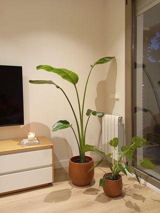 Planta de interior Strelitzia Nicolai, también conocida como Ave del Paraíso gigante. Es una planta de gran tamaño con hojas verdes y alargadas. - Maceta de terracota NO incluida. - Ideal para espacios amplios.