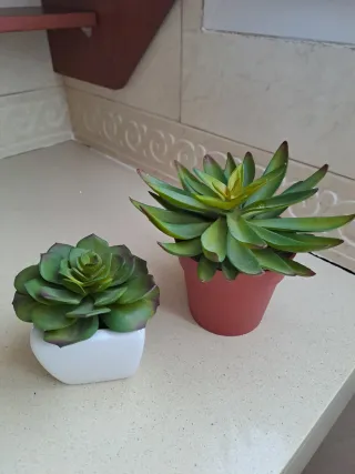 Conjunto de dos plantas artificiales, perfectas para añadir un toque verde a tu hogar sin necesidad de mantenimiento. - Una planta en maceta blanca de ceramica cuadrada. - Otra planta en maceta color terracota redonda en plastico.