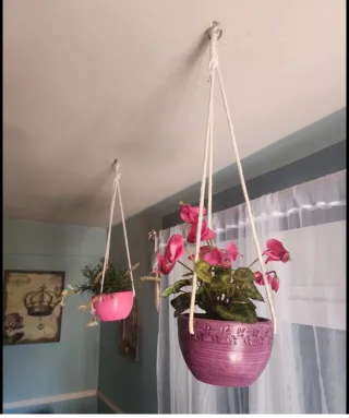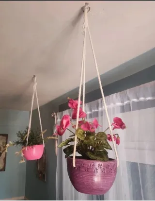 Conjunto de dos macetas colgantes decorativas con plantas artificiales. - Una maceta es de color rosa y la otra morada. - Ambas macetas están hechas de cerámica. - Las plantas son de plástico y dan un toque de color a cualquier espacio.