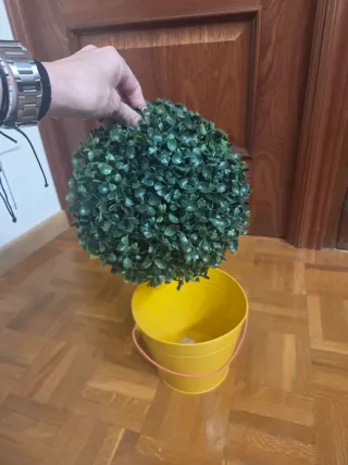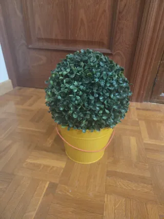 Planta artificial decorativa con forma de bola, ideal para interiores. - Planta tipo boj. - Maceta metálica de color amarillo. - Asa de alambre en la maceta. - 33cm de altura.