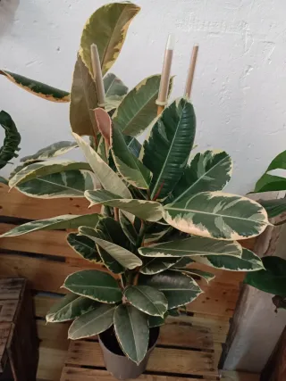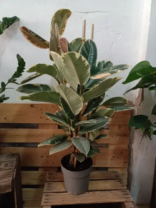 Planta de interior Ficus El Tineke en maceta de 20 cm de diámetro y 90 cm de alto aprox . Presenta hojas grandes y variegadas con tonos verdes, crema y toques rosados. - Hojas grandes y llamativas. - Variedad Tineke. - Se hacen envíos, no elegir Impost para el envío de plantas.
