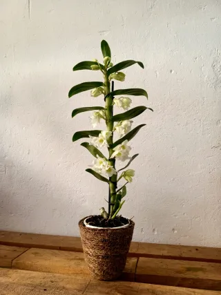 Planta de orquídea Dendrobium con flores blancas. - Altura aproximada de la planta: 60 cm. - Maceta de fibra de coco no incluida. - Ideal para coleccionistas o amantes de las plantas. Se hacen envíos