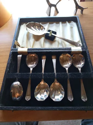 Elegante juego de cubiertos antiguos, perfecto para ocasiones especiales o para añadir un toque clásico a tu mesa. Incluye una cuchara de servir grande. - Diseño detallado en los mangos. - Acabado brillante. - Presentado en una caja forrada.