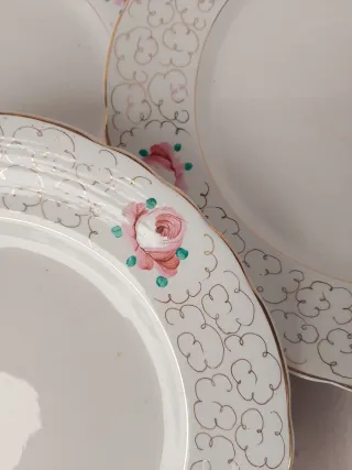 Precioso conjunto de cinco platos de postre de porcelana francesa, decorados con delicadas rosas. ✨Características - Porcela fina de alta calida - Diseño floral. - Borde festoneado con detalles dorados. - Textura en relieve - Diametro 18cm ✨ Estado: como nuevo. El borde dorado está en perfectas condiciones. A pesar de ser una pieza antigua, los platos están impecables. Sin roturas ni grietas. Platos con mucho encanto e ideales para vestir cualquier mesa. Las fotografía forman parte de la descripción del producto.
