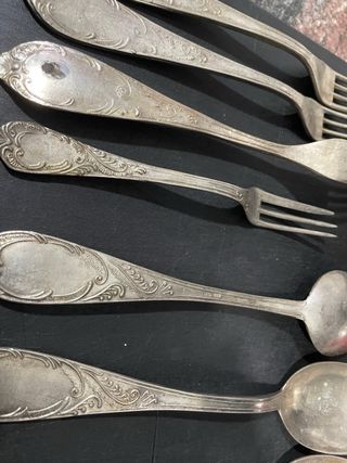 Conjunto de cubiertos antiguos con un diseño elegante y detallado. - Fabricados en metal con acabado plateado. - Presentan grabados ornamentales en los mangos. - Incluye tenedores y cucharas de diferentes tamaños.