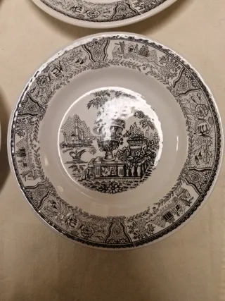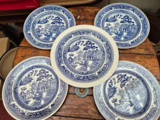 Conjunto de cinco platos de porcelana con un diseño clásico. (Uno de ellos es de gran tamaño, tipo fuente) John Tams, England. 4 llanos y un gran plato. PRECIO DEL LOTE COMPLETO Medidas aproximadas Diámetros 27.2 y 31.4cm Oportunidad, chollo, ganga, coleccionismo, coleccion, antigua, antiguo, willow, Tams, vajilla, vintage