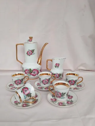 Precioso juego de café antiguo de porcelana, completo de 12 servicios, en perfecto estado. Incluye: ☕ Cafetera 🍬 Azucarero con tapa 🥛 Lechera ☕ 12 tazas 🍽️ 12 platos Decoración elegante en tonos blanco y beige con motivos florales y detalles en oro de ley. Piezas pintadas a mano (ver sello en fotos). Sin golpes, grietas ni desperfectos. Ideal para coleccionistas, decoración vintage o uso en ocasiones especiales. 📦 Hago envíos (embalaje cuidadoso)