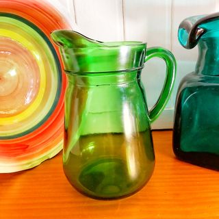 JARRA LÍQUIDO LITRO color VERDE. Como la de Duralex, pero más elegante. DISEÑO ÚNICO. VINTAGE RETRO. Con asas para servir cómodamente en mesa. MEDIDAS aproximadas: 20 × 14. ORNAMENTAL y DECORATIVA, para múltiples usos... junto otras piezas de vidrio, damajuanas, etc. Muy PINTEREST DECO. Buen estado de conservación. HAGO ENVÍOS Y LOTES envueltos con cuidado. Más ANTIGÜEDADES y CURIOSIDADES en mi PERFIL. antigua antiguo antigüedad interiorismo taller casa hogar rústico bohemio boho chic reliquia oferta regalo vintage retro