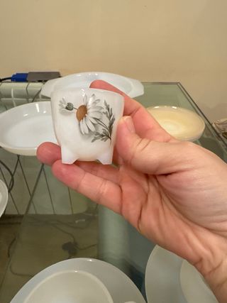 Tengo 5 uds. Están perfectos. Van con tazas tamaño mokka. 2 son blancos y 3 rosa / beige para tazas Arcopal Arlequín.
