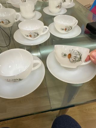 Seis tazas con sus respectivos platos, para café, capuchino o té. De la marca ARCOPAL, resistentes a los golpes, se pueden meter en el lavavajillas y en el microondas. Estan sin usar porque tengo otras seis para uso.