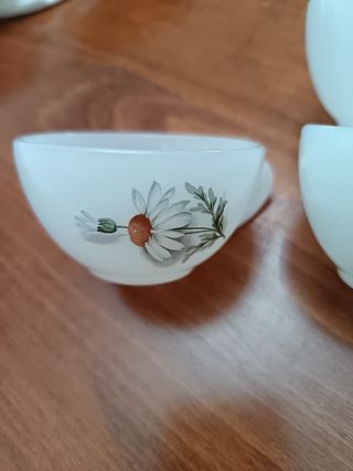 Conjunto de cinco tazas con un encantador diseño de margaritas en cristal opalino buscadas por colecionistas - Diseño floral de margaritas. - Estilo vintage. - Material de vidrio opalino. En mi perfil puedes encontrar muchas más piezas de esta vajilla y otros artículos. 2 € cada unidad, miden 7 cm. De diámetro por 4 cm. De altura