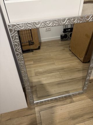 Elegante espejo decorativo con un marco de madera en acabado plateado. Tiene algunas marquitas en los cantos, pero está muy bien conservado. Medidas: 94 x 75 x 3 de grosor.