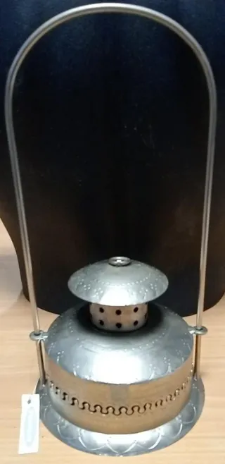 Farol decorativo de metal con un diseño intrincado. - Acabado plateado. - Asa para colgar o transportar. - Detalles grabados en la base y la tapa.
