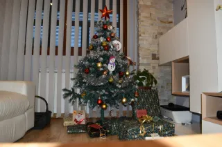 Árbol de Navidad artificial de 150cm,con adornos - Decorado con esferas rojas y doradas. - Guirnalda plateada. -Luces de colores -Nacimiento portal de Belén. Solo entrega en mano.