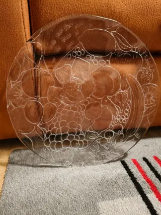 Set de dos fuentes de cristal con un diseño intrincado y elegante. Ideales para servir aperitivos o postres. - Diseño con motivos geométricos. Cristal tallado. - Borde con detalles acanalados. Medidas: Fuente grande: Diámetro = 24 cm Fuente pequeña: Diámetro = 19 cm . La fuente grande es de la marca: Les Verreires Du Gier ( Veropa ) Francia.