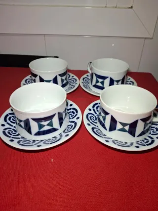 Conjunto de tazas y platillos de la reconocida marca Sargadelos. El diseño presenta un patrón geométrico en tonos azules y blancos. - Cuatro tazas. - Cuatro platillos a juego.