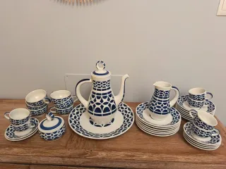 Elegante juego de café de la marca Sargadelos. Incluye varias tazas y platos. - Diseño con motivos geométricos en azul y blanco. - Fabricado en porcelana de alta calidad. - Incluye cafetera y lechera.