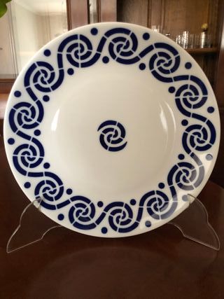 Precioso plato de Sargadelos con un diseño geométrico en azul y blanco. - Diseño circular central. - Borde exterior con patrón de bloques azules.