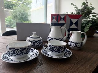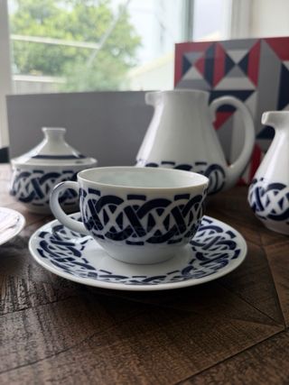 Elegante juego de café de la reconocida marca Sargadelos. Piezas con un diseño clásico y distintivo. - Incluye tetera, lechera, tazas y platos. - Motivos de nudos celtas en azul sobre blanco.