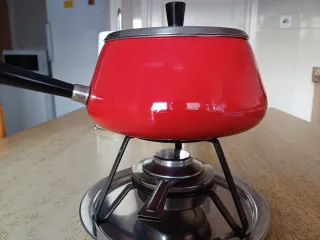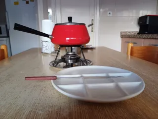 Completo set para preparar fondue, ideal para compartir. - Cacerola roja con asa negra. - Hornillo metálico. - Seis platos con divisiones. - Pinchos para fondue.