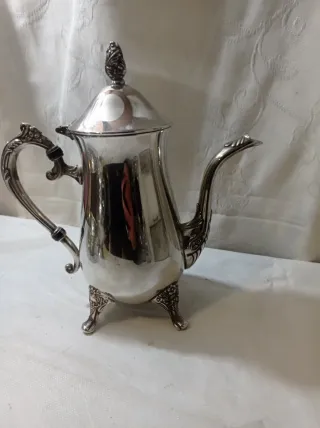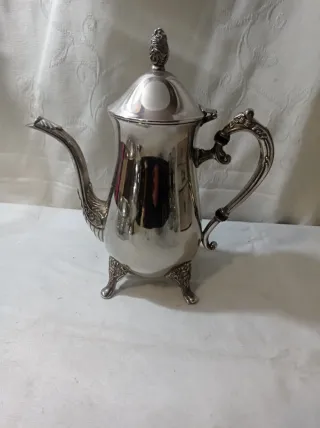 Elegante jarra de metal con un acabado plateado brillante. Su diseño clásico incluye patas decorativas y un asa curva. - Diseño con tres patas ornamentadas. - Asa ergonómica con detalles. - Tapa con un pináculo decorativo.