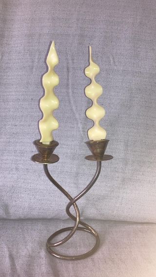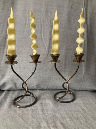 Elegante pareja de candelabros con un diseño retorcido y base circular. - Acabado metálico en tonos dorados y plateados.