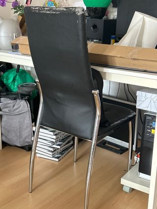 Conjunto de cuatro sillas con estructura metálica y tapizado sintético. - Tapizado con desgaste visible. - Patas de metal plateado.